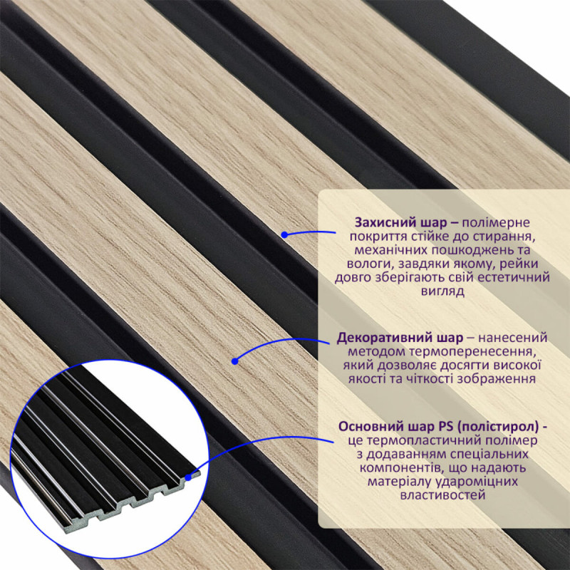 1. Захисний шар – полімерне покриття стійке до стирання, механічних пошкоджень та вологи, завдяки якому, рейки довго зберігають свій естетичний вигляд.
