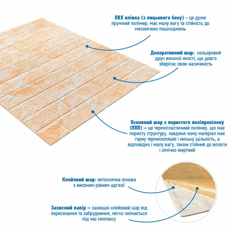 Самоклеящиеся 3D панели – декоративное покрытие для стен, выполненное из легкого и прочного материала – пористого полипропилена (ППП). Основная особенность - рельефный рисунок в виде кирпичей в широком разнообразии цветовой гаммы и наличие клеевого слоя, что позволяет установить панели без необходимости применения дополнительных материалов.