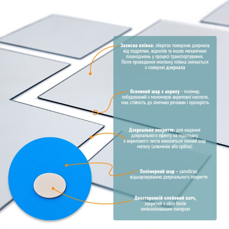 • Зеркальный слой: это тонкое металлизированное или полимерное покрытие, которое наносится на акриловую основу и создает эффект зеркального отражения. Оно имеет гладкую, светоотражающую поверхность, устойчивую к влаге и износу. Благодаря гибкости материала отражение может немного искажаться, особенно при наклеивании на неровные или изогнутые поверхности.